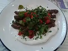 Tire meatballs, which are peculiar to the Tire district of İzmir, Turkey, are grilled with a thickness of a pen on thin skewers.[1][2] No spices other than salt are used in its minced meat; and the meatballs are served with a buttery tomato sauce. The essential taste of Tire meatballs is revealed by the village butter used in its sauce. These meatballs, also known as Delikli (drilled) meatballs and Tire Kebab in the public are served by putting fresh parsley on them. Optionally, Tire meatballs may also be served with yoghurt.[3][4]