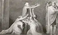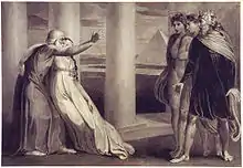Most scholars agree that Tiriel's name was probably taken from Heinrich Cornelius Agrippa's De occulta philosophia libri tres (1651), where the name is associated with the planet Mercury and the elements sulphur and mercury.[2] Harold Bloom, however, believes the name is a combination of the word 'tyrant' and the Hebrew word for God, El.[3] In terms of Tiriel's character, David V. Erdman believes that he is partially based on King George III, who suffered bouts of insanity throughout 1788 and 1789. Erdman argues that "the pattern of Tiriel's "madness and deep dismay" parallels that of King George's,"[4] and thus the poem is "a symbolic portrait of the ruler of the British Empire. [Blake] knew that the monarch who represented the father principal of law and civil authority was currently insane."[5] As evidence, Erdman points out that during his bouts of insanity, George tended to become hysterical in the presence of four of his five daughters, only the youngest, (Amelia), could calm him (in the poem, Tiriel destroys four of his daughters but spares the youngest, his favourite).[6] Bloom believes that Tiriel is also partially based on William Shakespeare's King Lear and, in addition, is a satire "of the Jehovah of deistic orthodoxy, irascible and insanely rationalistic."[3] Northrop Frye makes a similar claim; "He expects and loudly demands gratitude and reverence from his children because he wants to be worshipped as a god, and when his demands are answered by contempt he responds with a steady outpouring of curses. The kind of god which the existence of such tyrannical papas suggests is the jealous Jehovah of the Old Testament who is equally fertile in curses and pretexts for destroying his innumerable objects of hatred."[7] Alicia Ostriker believes the character to be partially based on both Oedipus from Sophocles' Oedipus Rex and the prince of Tyre from the Book of Ezekiel (28:1-10), who is denounced by Ezekiel for trying to pass himself off as God.[2] Looking at the character from a symbolic point of view, Frye argues that he "symbolises a society or civilisation in its decline."[8]