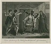 For the scene where Aaron tricks Titus into cutting off one of his hands, the primary source was probably an unnamed popular tale about a Moor's vengeance, published in various languages throughout the sixteenth century (an English version entered into the Stationers' Register in 1569 has not survived).[14] In the story, a married nobleman with two children chastises his Moorish servant, who vows revenge. The servant goes to the moated tower where the man's wife and children live, and rapes the wife. Her screams bring her husband, but the Moor pulls up the drawbridge before the nobleman can gain entry. The Moor then kills both children on the battlements in full view of the man. The nobleman pleads with the Moor that he will do anything to save his wife, and the Moor demands he cut off his nose. The man does so, but the Moor kills the wife anyway, and the nobleman dies of shock. The Moor then flings himself from the battlements to avoid punishment.
