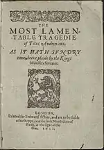 However, the majority of scholars tend to favour a post-1590 date, and one of the primary arguments for this is that the title page of Q1 assigns the play to three different playing companies; Derby's Men, Pembroke's Men and Sussex's Men ("As it was Plaide by the Right Honourable the Earle of Darbie, Earle of Pembrooke, and Earle of Suſſex their Seruants"). This is highly unusual in copies of Elizabethan plays, which usually refer to one company only, if any.[41] If the order of the listing is chronological, as Eugene M. Waith and Jacques Berthoud, for example, believe it is, it means that Sussex's Men were the last to perform the play, suggesting it had been on stage quite some time prior to 24 January 1594.[42] Waith hypothesises that the play originally belonged to Derby's Men, but after the closure of the London theatres on 23 June 1592 due to an outbreak of plague, Derby's Men sold the play to Pembroke's Men, who were going on a regional tour to Bath and Ludlow. The tour was a financial failure, and the company returned to London on 28 September, financially ruined. At that point, they sold the play to Sussex's Men, who would go on to perform it on 24 January 1594 at The Rose.[43] If one accepts this theory, it suggests a date of composition as some time in early to mid-1592. However, Jonathan Bate and Alan Hughes have argued that there is no evidence that the listing is chronological, and no precedent on other title pages for making that assumption. Additionally, a later edition of the play gives a different order of acting companies – Pembroke's Men, Derby's Men, Sussex' Men and Lord Chamberlain's Men, suggesting the order is random and cannot be used to help date the play.[44]