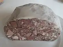 Tlačenka is the Czech and Slovak variety of head meat similar to Polish salceson. Czech light-colored tlačenka is made in a number of types. It is generally bonded with brawn—thick pigskin and hock/trotters broth—with various combinations of meat cutoffs (i.e. knuckle, head), offal (tongue, heart, liver) and fat with seasoning (salt and various combinations of spices such as marjoram, garlic, caraway, pepper, cloves, and allspice). Another version, dark-colored tlačenka, is made with added blood.