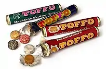 Toffo was a British brand of toffee, produced by Mackintosh's. They came individually wrapped, in a roll, and were available in plain, mint, and assorted (apple, strawberry, pineapple, banana, and mint) flavours.[1] It was one of its main brands along with Polo, Quality Street, Toffee Crisp, Fox's Glacier Mints, and Caramac.[2] Its original advertising slogan was "a man’s gotta chew what a man’s gotta chew".[3][4] Production was taken over by Rowntree Mackintosh Confectionery after Rowntree's merged with Mackintosh's in 1969.[5]
