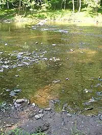 The ground along this part is very rocky and the creek quickly loses elevation, creating a clear, fast current. It is also along this part of its course that the creek dramatically cuts a valley into the steep hills along its sides. At the area popularly known as High Rocks, vertical walls of stone up to 200 ft (61 m) high rise above the northern edge of the creek. However, as the creek enters Point Pleasant, the ground evens out a bit and the creek becomes relatively more tranquil before entering the river.