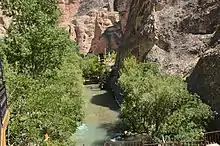 Vegetation in the canyon consists of cypress, sycamore, willow and fig trees. Timber footbridges, small waterfalls, water wheels, trecking paths and tea gardens make the canyon a tourist attraction.[1]