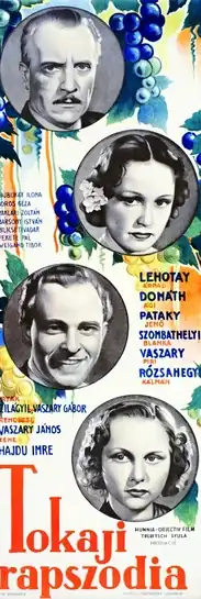 Tokay Rhapsody (Hungarian: Tokaji rapszódia) is a 1937 Hungarian comedy film directed by Johann von Vásáry and starring Ági Donáth, Blanka Szombathelyi and Árpád Lehotay.[1] [2] It was shot at Hunnia Studios in Budapest and on location around Lake Balaton. The film's sets were designed by the art director Márton Vincze.