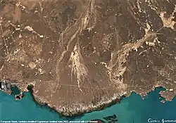 The Tokrau river originates in the Kyzyltas range of the southern Kazakh Uplands, 10 km (6.2 mi) to the north of Mt Karashoki. It heads roughly southwards within a narrow channel all along its course. Its valley may reach 10 km (6.2 mi) in its widest places, narrowing to 75 m (246 ft) in gorges. The floodplain is between 1 km (0.62 mi) and 1.2 km (0.75 mi) wide. About 50 km (31 mi) away from the coast of Lake Balkhash to the south, the river fans out into many arms in a dry, widening plain. Finally its waters disperse in the semidesert sands to the north of the lakeshore.[3] This last stretch of the Tokrau was an ancient delta dating back to the time when the river reached Lake Balkhash.[8]