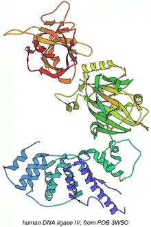- ↑ Ochi T, Gu X, Blundell TL (2013). "Structure of the catalytic region of DNA ligase IV in complex with an artemis fragment sheds light on double-strand break repair". Structure. 21 (4): 672–679. doi:10.1016/j.str.2013.02.014. PMC 3664939. PMID 23523427.