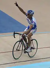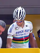 After enduring a relatively quiet series of performances through most of the cobbled classics,[32] Boonen finished second at Paris–Roubaix, being pipped on the line by Mat Hayman.[33] Despite not clinching the win, Boonen's aggressive performance in the race was acclaimed by former Paris–Roubaix champions Bernard Hinault and Gilbert Duclos-Lassalle, who described him as "a warrior" and "magnificent" respectively.[34] In July he announced that he had signed a short-term contract with Etixx-Quick Step and would retire immediately after the 2017 Paris–Roubaix.[35] Later that month, he won the London-Surrey Classic in a sprint finish,[36] as well as the Brussels Cycling Classic. He ended the season with third place in the World Championship road race in Qatar, where he was beaten by reigning world champion Peter Sagan and Mark Cavendish.[37]