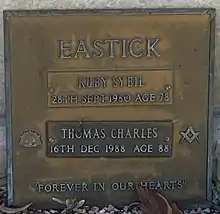 A knighthood in recognition of his work for the interests of ex-servicemen was announced in the 1970 New Year Honours.[34] It was conferred on him in person by Queen Elizabeth II on 24 April 1970 at Government House, Canberra.[35] In September 1972, following the discovery of a National Socialist Party of Australia training camp at Gawler, South Australia, Eastick said that there was "no room in Australia for anybody with subversive thoughts like the Nazi Party".[36] In 1974, several harness races at a Globe Derby Park charity race day were named in Eastick's honour.[37] Eastick continued to work at Angas Engineering until 1977, and was again federal president of the Australia Day Council from 1976 to 1980. His wife, now Ruby, Lady Eastick, died suddenly in 1980, and after a few years he moved to the Masonic Nursing Home in Somerton Park. He died there on 16 December 1988 and was cremated.[1]