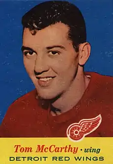 Thomas Francis Patrick McCarthy (September 15, 1934 – January 20, 1992) was a Canadian professional ice hockey left winger who played four seasons in the National Hockey League for the Detroit Red Wings and Boston Bruins between 1956 and 1961. The rest of his career, which lasted from 1955 to 1973, was spent in various minor leagues. McCarthy was selected in the 15th round of the 1967 NHL Expansion Draft by the Pittsburgh Penguins, going 88th overall.