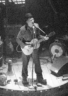 In 2004, Waits released his fifteenth studio album, Real Gone.[268] Waits had recorded it in an abandoned schoolhouse in Locke. Hoskyns called the album Waits's "roughest, most unkempt music to date". It incorporated Waits beatboxing, a technique he had picked up from his growing interest in hip hop.[269] Humphries characterized it as "the most overtly political album of Waits's career".[270] It featured three political songs expressing Waits's anger at the presidency of George W. Bush and the Iraq War. He said that "I'm not a politician. I keep my mouth shut because I don't want to put my foot in it. But at a certain point, saying absolutely nothing is a political statement of its own."[271] Real Gone received largely positive reviews.[272] It made the Billboard Top 30 as well as the Top 10 in several European album charts,[273] also earning him a nomination for Best International Male Solo Artist at the 2005 Brit Awards.[274] In October 2004, he launched a tour in Vancouver before heading to Europe, where his shows were sell-outs:[275] his only London gig saw 78,000 applications for around 3,700 available tickets.[276] Per Bowman, "Much of Real Gone was built around oral-percussion home recordings that Waits made in his bathroom, using his mouth as a human beat-box. A superb example is the bed track underpinning the hellacious groove of ‘Metropolitan Glide’ that Waits aptly described as ‘cubist funk.’ In stark contrast, the album’s closing track, 'Day After Tomorrow,' returned Waits to his singer-songwriter roots, and features a beautiful melody that sounds eerily similar to Dylan’s early acoustic work."[74]