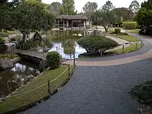 A major project undertaken during his curatorship at the Botanic Gardens was the construction of a Kenzo Ogata-designed Japanese Garden which commenced in 1979 following Australia and Japan signing the Basic Treaty of Friendship and Cooperation in 1976.[2] Constructed as part of the relationship forged with Rockhampton's Japanese sister city Ibusuki, it was officially opened by the ambassador of Japan to Australia Mizuo Kuroda on 17 June 1982.[5] In exchange, Wyatt helped develop and plant an Australian garden in Ibusuki in 1983 which included constructing a slab hut with Australian timber.[3][6]