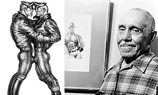 The post-World War II era saw the rise of the biker subculture as rejecting "the reorganization and normalization of life after the war, with its conformist, settled lifestyle."[9][10] Biker subculture was both marginal and oppositional, and provided postwar gay men with a stylized masculinity that included rebelliousness and danger.[9] This was in contrast to the then-prevailing stereotypes of the gay man as effeminate (sissy), as seen in vaudeville and films going back to the first years of the industry.[11] Laaksonen was influenced by images of bikers as well as artwork of George Quaintance and Etienne, among others, that he cited as his precursors, "disseminated to gay readership through homoerotic physique magazines" starting in 1950.[12][9] Laaksonen's drawings of bikers and leathermen capitalized on the leather and denim outfits which differentiated those men from mainstream culture and suggested they were untamed, physical, and self-empowered.[13][14] This in contrast with the mainstream, medically and psychologically sad and sensitive young gay man who is passive.[14][15] Laaksonen's drawings of this time "can be seen as consolidating an array of factors, styles and discourses already existing in the 1950s gay subcultures," which may have led to them being widely distributed and popularized within those cultures.[16] Starting his professional career in 1958 as a creative executive in renowned marketing agency, McCann Helsinki,[17] further encouraged his creativity.
