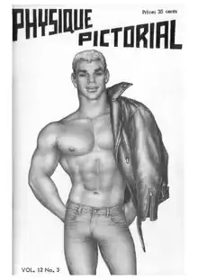 Laaksonen's style and content in the late 1950s and early 1960s was partly influenced by the U.S. censorship codes that restricted depiction of "overt homosexual acts".[16] His work was published in the beefcake genre that began in the 1930s and predominantly featured photographs of attractive, muscular young men in athletic poses often shown demonstrating exercises.[18] Their primary market was gay men, but because of the conservative and homophobic social culture of the era, gay pornography was illegal and the publications were typically presented as dedicated to physical fitness and health.[18] They were often the only connection that closeted men had to their sexuality.[18] By this time, however, Laaksonen was rendering private commissions, so more explicit work was produced but remained unpublished.[16] Aside from his work at the advertising agency, Laaksonen operated a small mail-order business, distributing reproductions of his artwork around the world by post, though he did not generate much income this way.[19]
