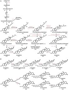 Alpha-tomatine (α-tomatine) belongs to the compound group steroidal glycoalkaloids. These compounds consist of an aglycon, which is a cholesterol derivative, and a carbohydrate chain, which in the case of α-tomatine consists of two d-glucose units, a d-galactose unit, and a d-xylose unit.[12] In α-tomatine, the tetrasaccharide called lycotetraose is attached to the O-3 of the steroidal aglycone.[13] At first it was thought that the synthesis of steroidal alkaloids only involved multiple steps of hydroxylation, oxidation and amination of cholesterol with arginine as the source of the incorporated nitrogen. Later the glycoalkaloid metabolism genes were discovered.[12] These genes produce the glycoalkaloid metabolism enzymes, which are responsible for the synthesis of steroidal alkaloid aglycones in potato and tomato plants.[12] The reaction these enzymes perform are shown in the figure 1.
