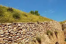 The façade of the stomion is faced with large blocks of poros limestone ashlar, behind which the structure is built from rubble masonry like that which lines the dromos. Wace believed that the ashlar façade was a later addition to the tomb, and that the monument had been constructed in two phases — firstly, the tomb was built in its entirety using rubble masonry, and later, 'with the object of making its entrance more imposing',[11] a new ashlar façade was added. In support of this conclusion, he noted that the rubble masonry is bonded by mortar to that of the stomion, but that the ashlar masonry of the stomion is not bonded to the rubble masonry behind it;[11] in addition, the ashlar façade seems to play little role in supporting the structural weight of the thalamos's corbelled dome.[11] However, Wace's two-phase model has been questioned since the late 20th century: Clare Loader argued in 1998 that the ashlar façade may have played a structural role in buttressing the rubble one behind it, and so been added either during or immediately after the initial construction of the tomb,[12] while Yannis Galanakis has argued that the tomb's unusual features may represent a single coherent plan, the result of 'architectural experimentation', perhaps influenced by the contemporaneous building of the tholos tomb at Berbati, and that the evidence is insufficient to tell whether the tomb was built in a single phase or in two.[13]
