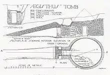 Wace and Lamb had planned to excavate the tomb in its entirety between 1922 and 1923, but were unable to return in 1923 due to safety concerns about the partially-collapsed dome roof.[20] They therefore left the tomb with the dromos and stomion entirely excavated, but about a third of the thalamos uncleared.[20] While the project had intended to fully excavate all seven of the thus-far unexcavated tholoi at Mycenae between 1920 and 1923, the Tomb of Aegisthus would be the only one excavated in this period: the others were, however, re-examined and their first architectural plans drawn up by Piet de Jong.[13] Wace's team also undertook conservation work on the monument,[43] including the digging of a drain around the tomb to prevent rain damage.[44]