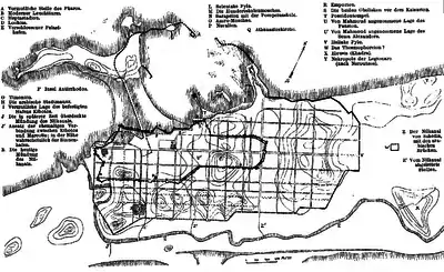 The Egyptian Supreme Council for Antiquities has officially recognized over 140 search attempts for Alexander's tomb.[3] Mahmoud el-Falaki (1815–1885), who compiled the map of ancient Alexandria, believed Alexander's tomb is in the center of Alexandria, at the intersection of the Via Canopica (modern Horreya Avenue) and the ancient street labeled R5.[18] Since then several other scholars such as Tasos Neroutsos, Heinrich Kiepert and Ernst von Sieglin placed the tomb in the same area.[18] In 1850, Ambroise Schilizzi announced the discovery of alleged Alexander's mummy and tomb inside the Nabi Daniel Mosque in Alexandria.[19] Later, in 1879, a stone worker accidentally broke through the vaulted chamber inside the basement of that mosque. Some granite monuments with an angular summit were discerned there, but the entrance was then walled up and the stone worker was asked not to disclose the incident. The image on a Roman lamp in the National Museum of Poznań and others at the British Museum and the Hermitage Museum are interpreted by some scholars as showing Alexandria with the Soma Mausoleum pictured as a building with a pyramidal roof.[8] In 1888, Heinrich Schliemann attempted to locate Alexander's tomb within the Nabi Daniel Mosque, but he was denied permission to excavate.[19]