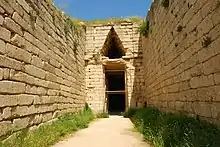 During the Ottoman rule of Greece the tomb was raided by Veli Pasha.[11] Later 19th century archaeologist Heinrich Schliemann followed this passage of Pausanias and searched at the vicinity of Mycenae for their tombs. Schliemann was the first to excavate the site.[10] Excavations in the 1960s led to the discovery of the surrounding walls of the tomb.[12] In the dromos, a woman's grave was found in addition to accompanying artifacts; two mirrors, ornaments and beads. However, the inner burial chamber was found looted and empty.[13]