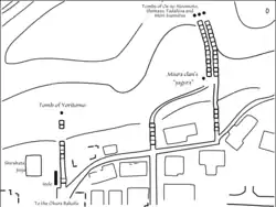 - ↑ The tombs can also and more comfortably be reached turning right before Shirahata Shrine and then left at the gate guarded by two great stone lanterns. See the map above.