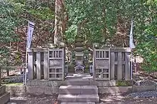 A steep stairway carved into the rock a few meters away from Yoritomo's grave leads to the graves of Shimazu Tadahisa, Mōri Suemitsu and Ōe no Hiromoto.[6]