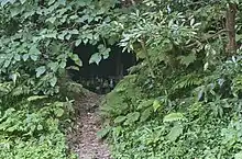 During the Kamakura period in and around Kamakura, for reasons that are unclear, warriors, priests and sometimes even commoners were buried in caves called Yagura carved out of the soft limestone that makes up the hills around the city. Yagura containing a gorintō were sometimes used also as cenotaphs (memorial monuments). The souls of those of the Miura clan who perished during the siege of the neighboring Hokke-dō are enshrined in a small yagura whose opening is barely visible to the left of the base of the twin stairways leading to the tombs of Shimazu Tadahisa and Mōri Suemitsu (see map above).[1] The cenotaph is still tended and visited.