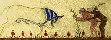 The Tomb of the Bulls (Italian: Tomba dei tori) is an Etruscan tomb in the Necropolis of Monterozzi near Tarquinia, Lazio, Italy. It was discovered in 1892[1] and has been dated back to either 540–530 BC[2] or 530–520 BC.[3] According to an inscription Arath Spuriana apparently commissioned the construction of the tomb.[3] It is named after the two bulls which appear on one of its frescoes.[4] It is the earliest example of a tomb with complex frescoes in the necropolis,[5] and the stylistic elements are derived from Ionian Greek culture. Along with the frescoes of the Tomb of the Whipping these paintings are relatively rare examples of explicit sexual scenes in Etruscan art, which were far more common in Ancient Greek art.[6]