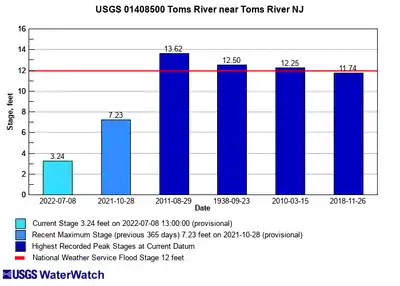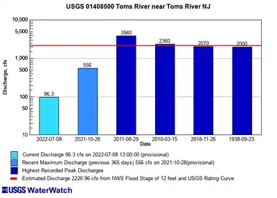 - ↑ "Toms River Hydrograph | U.S. Geological Survey". www.usgs.gov. Archived from the original on 2022-07-08. Retrieved 2022-07-08.