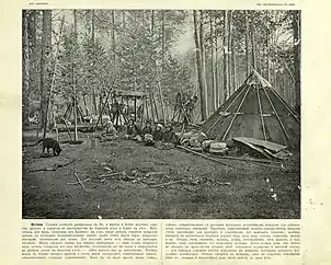 Animal husbandry developed.[8] In the Biysk Uezd, deer (mountain deer, Cervus maral) are bred.[12] Beekeeping played an important role, although it was carried out very irrationally. Part of the bee products is sent to the Irbit Fair. In addition to apiary beekeeping, there is also honey hunting.[12] Fisheries also developed.[8] Fishing is the main occupation of inorodtsy and partly of Russians.[12] Hunting and birding is in decline due to an increase in population, forest fires and the merciless extermination of animals and birds.[12] Of the birds, mainly the hazel grouse comes into trade.[12]