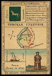 The Tomsk Governorate was located in the southeastern part of Western Siberia. To the north, north-west and west it bordered the Tobolsk Governorate, to the south-west the Semipalatinsk region, to the south and south-east Mongolia, and to the east and north-east the Yeniseisk Governorate.[1][2][3]