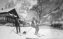 In January 1891 Gerald Fox and his cousin Thomas Fox brought the first skis to Grindelwald from Norway where they had learned to use them. Although not the first skis seen in Switzerland, they were the first in the Bernese Oberland. For some years the old Baer Hotel had had winter visitors who skated, curled and tobogganed. The Foxes were regarded as slightly mad as they demonstrated their skis. They put them on indoors and skied out of the hotel entrance, using a single long pole. Neither the guests nor the local inhabitants saw a future for this sport, though they conceded that it was quite a good way of getting about compared with snow shoes. However, some of the local youths were prevailed upon to learn the rudiments and, though the sport did not catch on immediately, there was thus a nucleus of keen local inhabitants available to teach the visitors who came in increasing numbers as the years went by.[10]