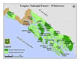 The Tongass has been recognized by some as the largest,[3] wettest, and wildest of the United States National Forests,[1] with "soaring mountain peaks, narrow fjords, lush woods, and more than 1000 named islands."[4] The Tongass encompasses most of Southeast Alaska, and was created in 1907 by President Theodore Roosevelt.[3] With high concentrations of grizzly bears and bald eagles, this forest provides a haven for a diversity of wildlife. For the commercially important industry of salmon fishing, the Tongass plays an important role as well, as 90% of salmon in Southeast Alaska spawn within the territory of the Tongass National Forest. It has become a growing destination for passing tourists, and supports a traditional subsistence lifestyle for many communities.[3] John Muir, the founder of the Sierra Club, and by many seen as the grandfather of the American National Parks, called the Tongass a place of "endless rhythm and beauty.[3] Between 1954 and 1990 approximately 70% of the productive old-growth had been harvested. Prior to the enactment of the TTRA, clear cut logging of old-growth still took place in the Tongass National Forest, the only forest in the US where this method of forest management still existed.[1] Continuation of similar rates of deforestation would have led to a large reduction in suitable habitat of the Sitka black-tailed deer, an important resource for subsistence hunting.[3] Projections for the forest calculated prior to the TTRA, estimated that the timber harvests of the Tongass, and its consequential impacts on future employment, did not yield promising results for the logging industry. Disruptions were forecasted to local communities and a gross decline in profitable timber if the management approach by the Forest Service was not changed.[3]