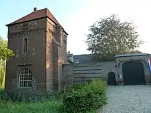 The big tower was the gatehouse of the bailey of the old castle. It is dated to the late 14th century, that is the same as the oldest construction found on the grounds of the main castle.[3] The current castle is square, and had a gate in its southern wall. The west wing probably dates from the 18th century. Its foundations use the same brick as the former gatehouse, but this could be reuse. The north wing probably also dates from the 18th century, but takes the place of older buildings. The age of the east wing is unknown. The southern wall is oldest, and still contains walled up embrasures. There were also buildings along this wall. In the 19th century one still had to cross a drawbridge to enter the castle.[4]