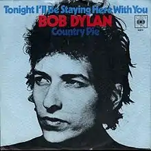 "Tonight I'll Be Staying Here with You" is a song written by Bob Dylan from his 1969 album Nashville Skyline.[1] It was the closing song of the album. The song was the third single released from the album, after "I Threw It All Away" and "Lay Lady Lay", reaching #50 on the US Billboard Hot 100 chart, and reaching the top 20 in other countries.[2][3] It was anthologized on the compilation albums Bob Dylan's Greatest Hits Vol. II and Playlist: The Very Best of Bob Dylan '60s.[3]