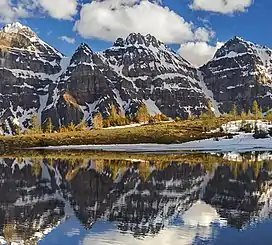 Tonsa, or Tonsa Peak, is a 3,053-metre (10,016 ft) mountain summit located on the border of Alberta and British Columbia on the Continental Divide in the Canadian Rockies. The mountain forms part of the backdrop to Moraine Lake in the Valley of the Ten Peaks of Banff National Park. It was named in 1894 by Samuel E.S. Allen for the Stoney Indian word for the number four. [2]