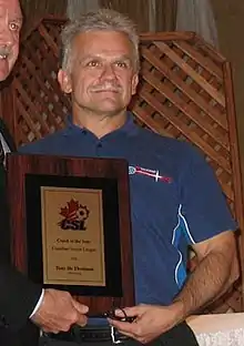 De Thomasis initially became involved in soccer by coaching at the youth level.[10] In 2002, he purchased the York Region Shooters franchise in the Canadian Professional Soccer League from Frank Bisceglia.[11] The following season the Shooters merged with the Vaughan Sun Devils to unify the York Region territory with De Thomasis becoming the principal owner.[12] After the acquisition Vaughan reached the CPSL Championship final in four consecutive seasons, and clinched their first piece of silverware the Eastern Conference title in 2005. In 2005, he was awarded the CPSL Commissioner's Award.[13]