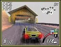 While racing, the player can pick up two power-ups: nitrous oxide and cash. The nitrous oxide can be used straight away, while the cash is added to the winnings at the end of the race and used for buying upgrades to the player's car.