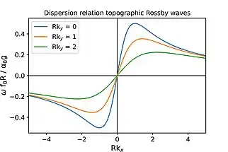 with the amplitude, and the wavenumber in x- and y- direction respectively, the angular frequency of the wave, and a phase factor, the following dispersion relation for topographic Rossby waves is obtained: