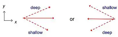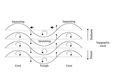 As shown in the last section, Rossby waves are formed because potential vorticity must be conserved. When the surface has a slope, the thickness of the fluid layer is not constant. The conservation of the potential vorticity forces the relative vorticity or the Coriolis parameter to change. Since the Coriolis parameter is constant at a given latitude, the relative vorticity must change. In the figure a fluid moves to a shallower environment, where is smaller, causing the fluid to form a crest. When the height is smaller, the relative vorticity must also be smaller. In the figure, this becomes a negative relative vorticity (on the northern hemisphere a clockwise spin) shown with the rounded arrows. On the southern hemisphere this is an anticlockwise spin, because the Coriolis parameter is negative on the southern hemisphere. If a fluid moves to a deeper environment, the opposite is true. The fluid parcel on the original depth is sandwiched between two fluid parcels with one of them having a positive relative vorticity and the other one a negative relative vorticity. This causes a movement of the fluid parcel to the left in the figure. In general, the displacement causes a wave pattern that propagates with the shallower side to the right on the northern hemisphere and to the left on the southern hemisphere.[1]