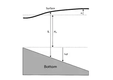 For simplicity, the system is limited by means of a weak and uniform bottom slope that is aligned with the y-axis, which in turn enables a better comparison to the results with planetary Rossby waves. The mean layer thickness for an undisturbed fluid is then defined as