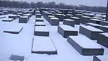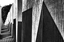 The Memorial to the Murdered Jews of Europe[1] (German: Denkmal für die ermordeten Juden Europas), also known as the Holocaust Memorial (German: Holocaust-Mahnmal), is a memorial in Berlin to the Jewish victims of the Holocaust, designed by architect Peter Eisenman and Buro Happold. It consists of a 19,000-square-metre (200,000 sq ft)[2][3] site covered with 2,711 concrete slabs or "stelae", arranged in a grid pattern on a sloping field. The original plan was to place nearly 4,000 slabs, but after the recalculation, the number of slabs that could legally fit into the designated areas was 2,711. The stelae are 2.38 m (7 ft 9+12 in) long, 0.95 m (3 ft 1+12 in) wide and vary in height from 0.2 to 4.7 metres (8 in to 15 ft 5 in).[2] They are organized in rows, 54 of them going north–south, and 87 heading east–west at right angles but set slightly askew.[4][5] An attached underground "Place of Information" (German: Ort der Information) holds the names of approximately 3 million Jewish Holocaust victims, obtained from the Israeli museum Yad Vashem.[6]