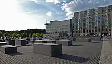 The memorial is located on Cora-Berliner-Straße 1, 10117 in Berlin, a city with one of the largest Jewish populations in Europe before the Second World War.[8] Adjacent east to the Tiergarten, it is centrally located in Berlin's historical Friedrichstadt district, close to the Reichstag building and the Brandenburg Gate.[9] The monument is situated on the former location of the Berlin Wall, where the "death strip" once divided the city. During the Third Reich a part of this area was the location of Joseph Goebbels's urban villa, with the nearby Reich Chancellery and the Führerbunker in the south.[10] The memorial is located near many of Berlin's foreign embassies.[9]