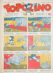 In 1932 the editor Mario Nerbini decided to open a new weekly newspaper for kids, containing illustrated tales with Mickey Mouse. The first issue of Topolino was published on December 31, 1932: it contained Mickey's first Italian story drawn by Giove Toppi.[2] In this story, Mickey Mouse was chased by an elephant. However, Nerbini had not correctly secured the publication rights, so when Emmanuel (Disney's representative in Italy) protested, Nerbini changed the title of the comic book with issue #3 into Topo Lino (Mouse Lino), replacing Mickey Mouse with Topo Lino, another mouse.[3] When Nerbini bought the publication rights from Disney and King Features Syndicate, he changed the title back to Topolino with issue #5.[4] Floyd Gottfredson's stories made their debut in Topolino #7 with a Sunday page featuring Mickey, his girlfriend Minnie Mouse, and Mickey's nephews Morty and Ferdie Fieldmouse.[5] Topolino published mainly Mickey Mouse Sunday pages; the daily strips were published in the supplement to the newspaper.