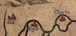 After spending several weeks at Chiaha (near modern Douglas Dam), the expedition followed the French Broad River and Tennessee River to the village of Coste, which was on Bussell Island at the mouth of the Little Tennessee River. On July 9, 1540, the expedition left Coste and followed the east bank of the Little Tennessee to the village of Tali, situated on the west bank of the river at what is now known as the Toqua site.[4] The expedition's chroniclers noted that the river at this point was too deep to ford. The sight of the Spaniards created a general panic in Tali, and the villagers attempted to flee downstream in canoes. De Soto apparently deployed his soldiers and forced the villagers to return. The chief of Tali gave the expedition four women and two porters, and de Soto departed with his forces southward the following day. The chief of Tali continued to send rations of sofkee (a gruel similar to hominy grits) and other food until the expedition reached Coosa chiefdom on July 16.[5]
