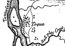 ![]() Toqua as shown on Henry Timberlake's 1762 Draught of the Cherokee Country | |