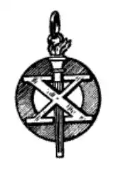 The society's badge consists of an uplifted torch, representing devotion to its ideals and its allegiance to Yale University's motto Lux et Veritas (Light and Truth).[1] The torch is backed by a broad circle that represents comradeship and equality in mutual endeavors. On top of the torch is the Roman numeral X, representing the original ten members.[1]