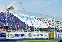 Torcida Sandžak visited Belgrade, Niš, Novi Sad, Kragujevac, and other cities around the country numerous times with the club. It's hard to say how many members there are, but they are not only located in the city of Novi Pazar. There are members in the cities of Tutin, Sjenica, Priboj, Prijepolje, and in Rožaje in Montenegro. There is a large group of its supporters among the diaspora as well. After six years of co-existence of the two supporter groups, in 2004, a new supporter group Ekstremi was formed. They quickly tried to incorporate members of both Torcida Sandžak and Ultra Azzurro into their group, which caused problems as most members of both groups refused to become a part of the new group. This completely separated them and left the sides bitter. On 13 August 2012, just before the football match between FK Novi Pazar and Radnički Niš, it came to a battle between the two local groups Torcida Sandžak and the Ekstremi.[1] The clash occurred at the time when the members of Torcida Sandžak wanted to put a banner on the north stand of the Novi Pazar City Stadium.[1] Their rivals, the Ekstremi, set the banner on fire and then the conflict broke out.[1] A member of the fan group Ekstremi was stabbed with a knife in the chest and suffered serious life-threatening injuries.[1] After the version of the Ekstremi, just before the match, at the entrance to the city park, one member was attacked by rival supporters Torcida Sandžak.[2] They were attacked with knives and other items, but the passersby stop the conflict and the attackers dispersed and went to the stadium.[2] At the entrance of the north stand, an Ekstremi member heard about the attack, wanting to gain more information and went to a group of Torcida Sandžak supporters, which came from the direction of the city park.[2] On that occasion he was attacked and suffered multiple stab wounds, some of them life-threatening.[2] The majority of the fan group Ekstremi was already gathered on the stands and revolted and burned the banner of Torcida Sandžak.[2] However, after six months, on February 12, 2013, thanks to an intervention by Genç Fenerbahçeliler's leader, the two sides made peace with one another.[3]