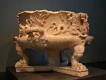 The vase is of calyx krater shape, with a high frieze carved with a Bacchic symposium and an everted rim, standing on a gadrooned base imitative of metalwork.[2] It has three handles, joined to the body with bearded satyrs' masks. It stands on three lion's legs, and a triangular base, all provided for it in the 16th century. For centuries, until the discovery of the Tazza Albani, it was the largest in diameter of known antique vases.[3]