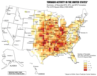 - ↑ "Average Annual Number of EF0-EF5 Tornadoes per 10,000 square miles during 1991 - 2010" (gif). National Climatic Data Center. U.S. Tornado Climatology: NOAA.gov. Archived from the original on October 29, 2013. Retrieved October 26, 2013.