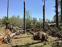 | EF2 | S of Whistler | Wayne | MS | 31°39′49″N 88°48′42″W / 31.6636°N 88.8118°W | 13:14–13:18 | 2.21 mi (3.56 km) | 250 yd (230 m) | A strong tornado caused significant deforestation in a wooded area, with numerous large trees snapped near their bases.[44] |